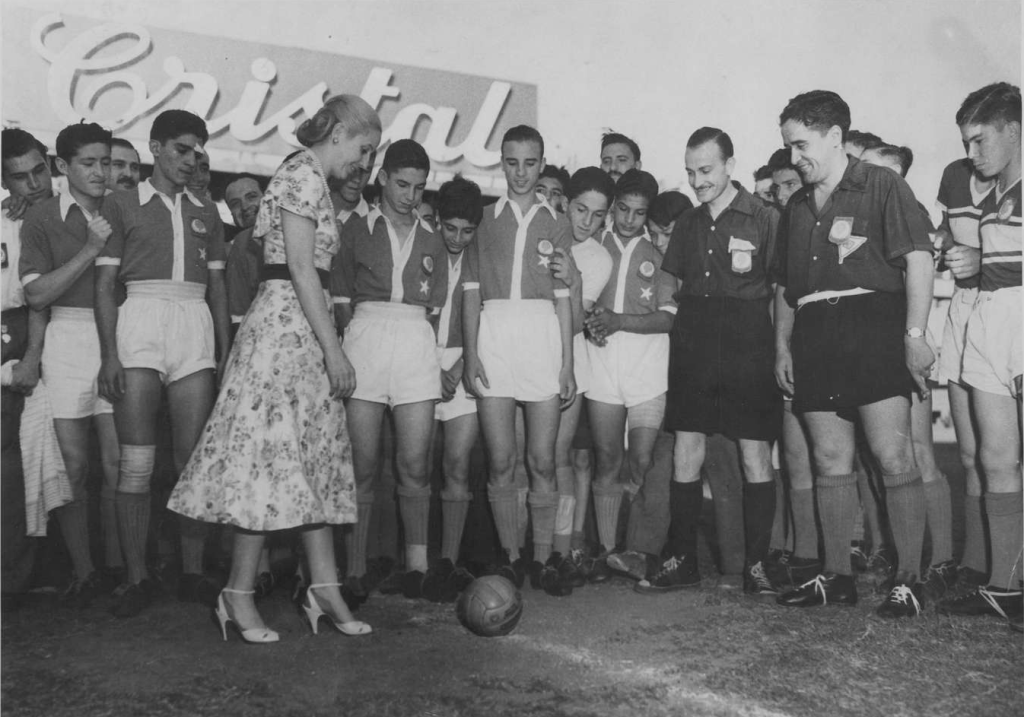 Eva Perón dando el puntapié inicial del partido disputado entre los equipos de Formosa y Santa Fe por el Campeonato de fútbol infantil “Evita” en el estadio de Boca Juniors.