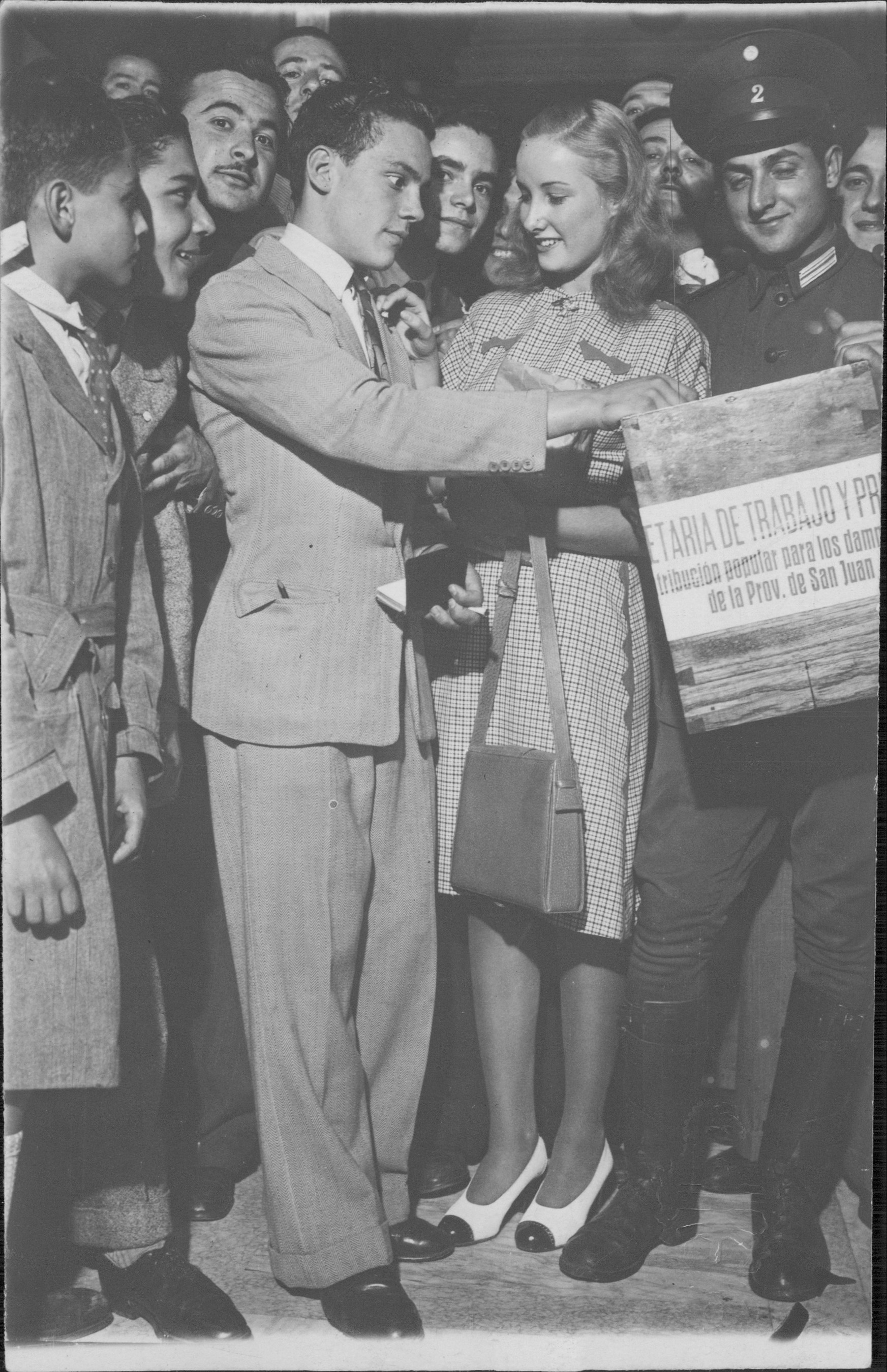 El 15 de enero de 1944 un terremoto destruyó la Ciudad de San Juan, dejando un saldo de 7000 muertos y 12000 heridos. Desde la Secretaría de Trabajo y Previsión, dirigida por Juan D. Perón, se organizó una movilización nacional con el fin de recaudar fondos. Para ello se convocó a “todos los representantes del trabajo, banco, industria, comercio, entidades deportivas y culturales.” Los artistas fueron los primeros que salieron a recolectar dinero. Algunas de las figuras destacadas fueron: Libertad Lamarque, Nini Marshall, Olinda Bozán, Blanca Podestá, Mirta Legrand, Lydia Lamaison, Enrique Muiño, Pepe Arias y Eva Duarte.